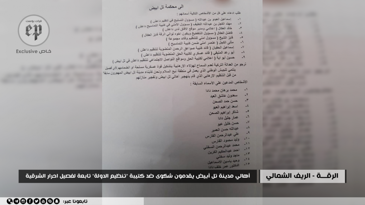 أفاد مراسل “فرات بوست” في الرقة، بأن مجموعة من سكان ريف الرقة الشمالي اشتكوا إلى محكمة تل أبيض، من وجود كتيبة تابعة لـ”تنظيم الدولة” قيد التشكيل، هدفها العمل في مناطقهم، وتحت حماية وتمويل “أحرار الشرقية” التابع لـ”الجيش الوطني السوري” المدعوم من تركيا.