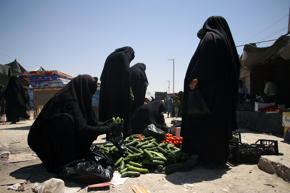 نساء لهن صلة بتنظيم الدولة “داعش” في سوق داخل مخيم الهول