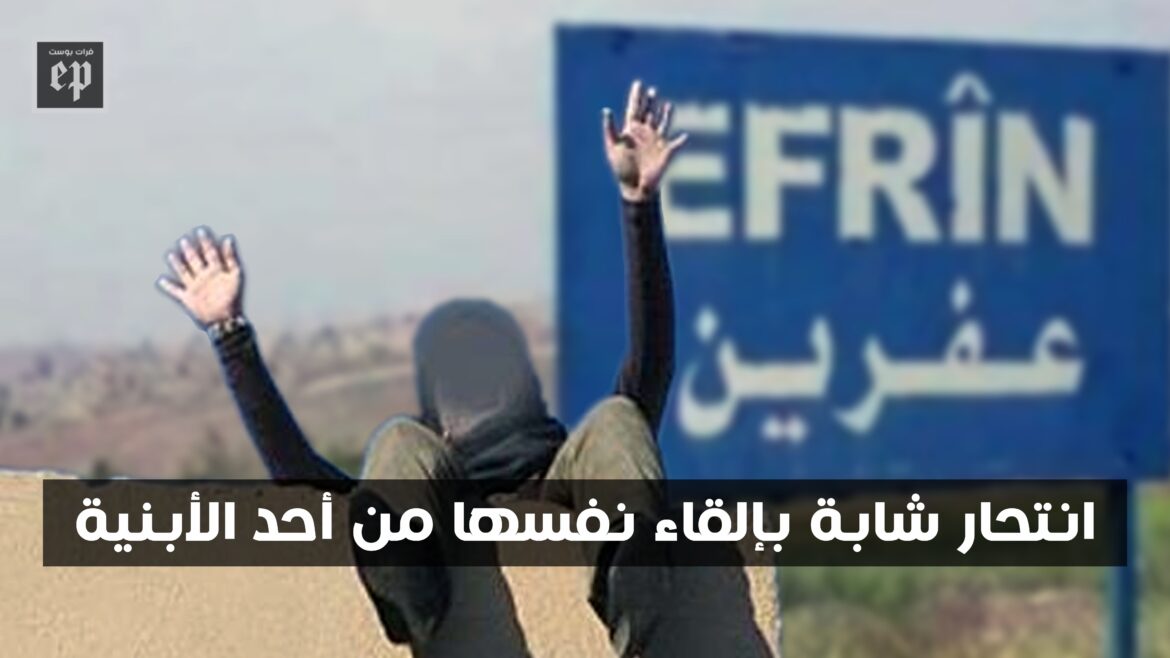 انتحرت فتاة في مدينة عفرين بريف حلب الشمالي، مساء الأحد، بعد إلقاء نفسها من أحد الأبنية في منطقة “شارع الفيلات”.