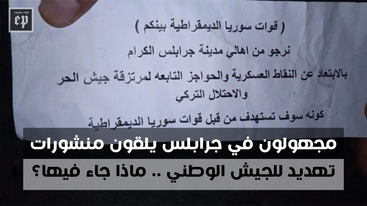أقدم مجهولون ملثمون، مساء أمس الثلاثاء 19 كانون الثاني، على إلقاء منشورات تهديدية في شوارع مدينة “جرابلس” بريف حلب الشرقي، والخاضعة لسيطرة الجيش الوطني.