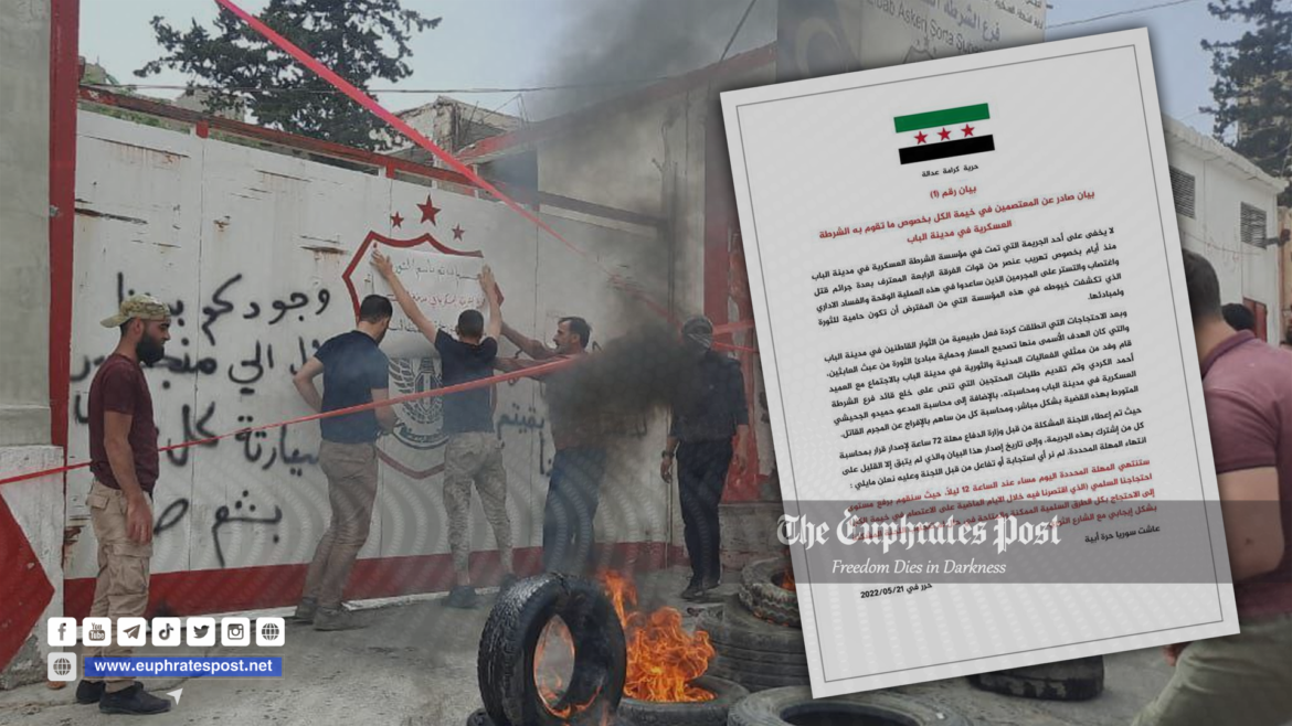 وافادت المصادر، إن المحتجين في مدينة الباب شرقي حلب، قطعوا الطرق الرئيسية في المدينة، وأغلقوا مركز الشرطة العسكرية، بالإطارات المشتعلة، عقب انتهاء المهلة المحددة لمحاسبة المتورطين.