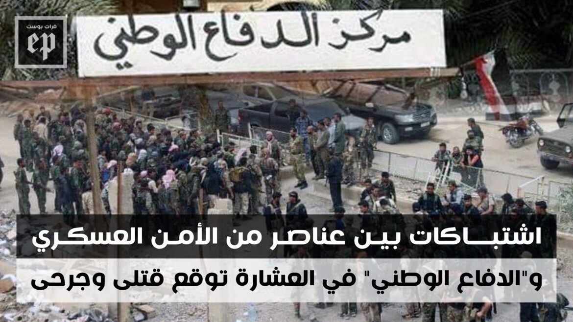 شهدت مدينة العشارة بريف ديرالزور الشرقي ظهر اليوم الاثنين اشتباكات بين مجموعة من ميليشيا “الدفاع الوطني” وعناصر من الامن العسكري بالأسلحة الرشاشة، أدت إلى وقوع 3 قتلى بين الطرفين، إضافة إلى مقتل السيدة صالحة حمود الدريهبة واصابة 5 آخرين بينهم طفلين يعملون في بيع الخضار.