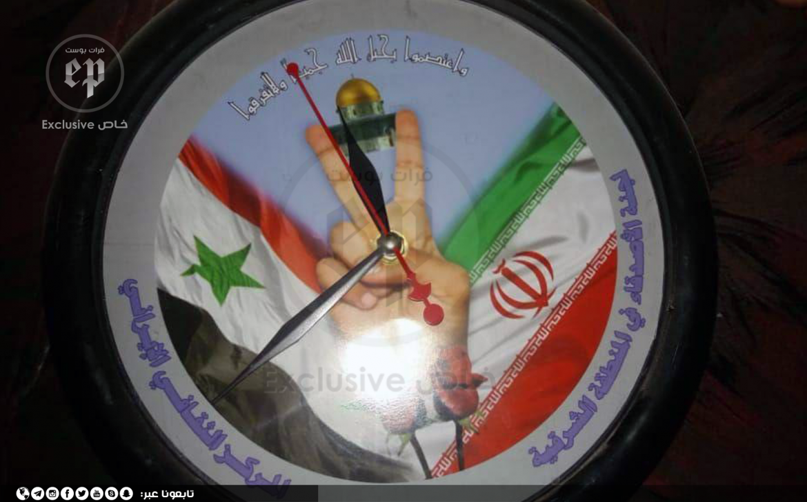 كما وزعت ساعات حائط منزلية عليها علم إيران والنظام، مكتوب عليها لجنة الأصدقاء في المنطقة الشرقية – المركز الثقافي الإيراني، وعليها صورة المسجد الأقصى