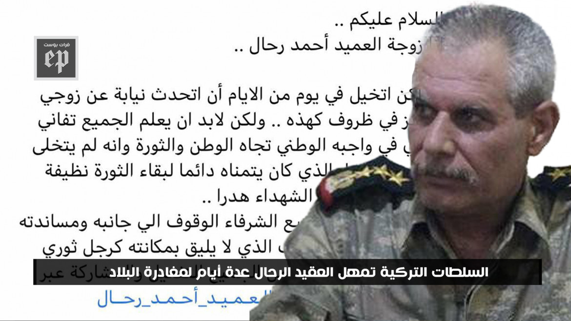 وكان قال شقيق العميد الركن أحمد رحال، على حسابه في فيسبوك، إن السلطات التركية قد اعلمتهم بأنها من اعتقلت شقيقه، دون أن تكشف المزيد من المعطيات.