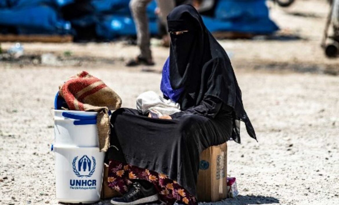 نساء وأطفال سوريون وعراقيون، ومنهم أجانب في مخيم الهول، يقف أمامهم عنصر من “قسد” (قوات سوريا الديمقراطية)-المصدر: إنترنت.