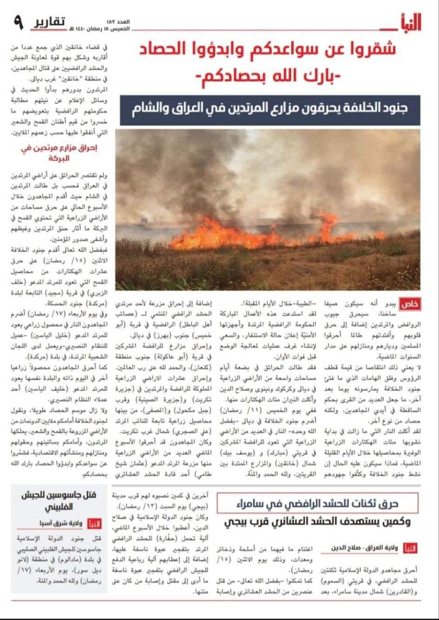 تبنى تنظيم الدولة عبر العدد 183 من صحيفة النبأ الأسبوعية (إحدى الأذرع الإعلامية للتنظيم) عملية حرق المحاصيل الزراعية الأخيرة في مناطق سيطرة قوات سوريا الديمقراطية “قسد”.