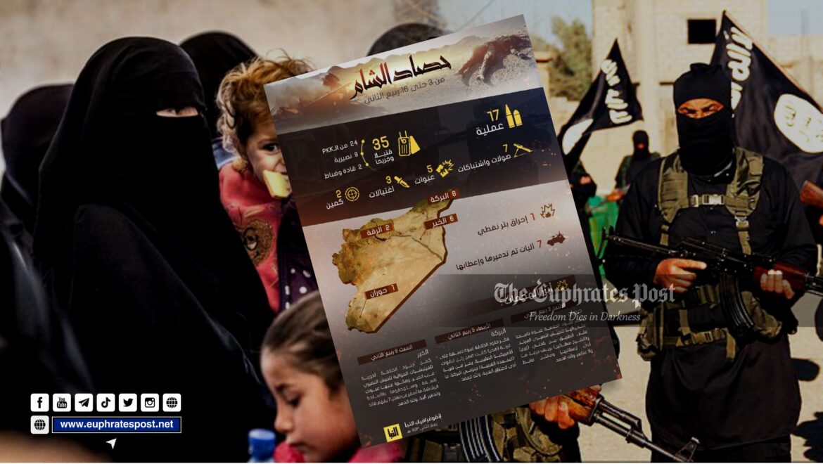 فبعد عودة نشاط “تنظيم الدولة” بشكلٍ واضحٍ عبر هجماتٍ في مناطق “قسد” ونظام الأسد، أصدر القسم الإعلامي للتنظيم ما أسماه بـ “حصاد الشام” والذي استعرض خلاله عمليات التنظيم في سوريا بين للفترة من 8-21 من شهر نوفمبر الحالي عبر “إنفوغرافيك” جاء فيه إحصائية لعدد العمليات والكمائن خلال هذه الفترة، وبلغ عددها 17 عملية تبناها بشكلٍ رسمي في مناطق متفرقة.