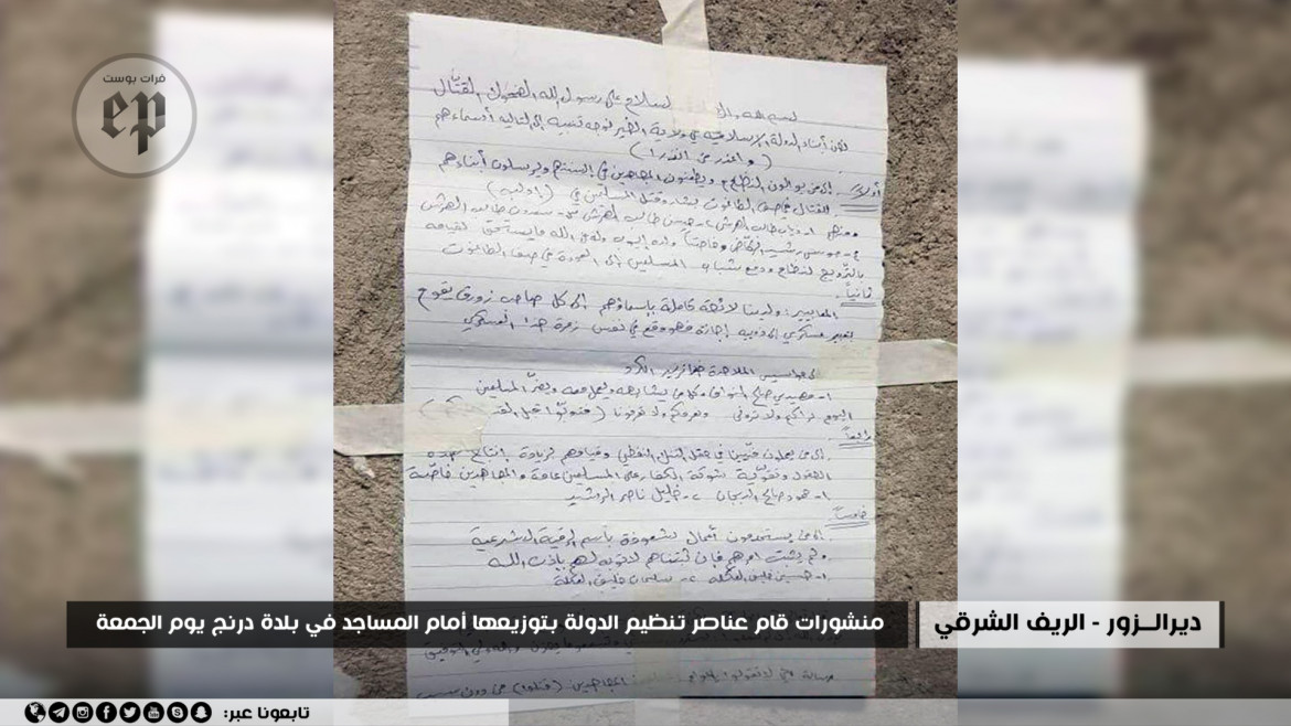 انتشرت منشورات لتنظيم الدولة على مساجد في قريتي “سويدان جزيرة” و”درنج” شرقي دير الزور تهدد بالتعامل مع نظام الأسد