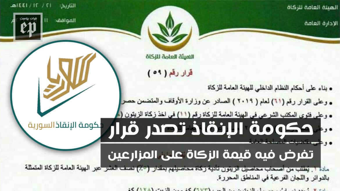 أصدرت حكومة الإنقاذ المدعومة من هيئة تحرير الشام، 11 آب، بيانا حددت فيه “قيمة الزكاة” التي يتوجب على المزارعين في إدلب دفعها لما يسمى “هيئة الزكاة” من المحاصيل المجموعة في الموسم بالتزامن مع حلول موعد قطاف الزيتون.