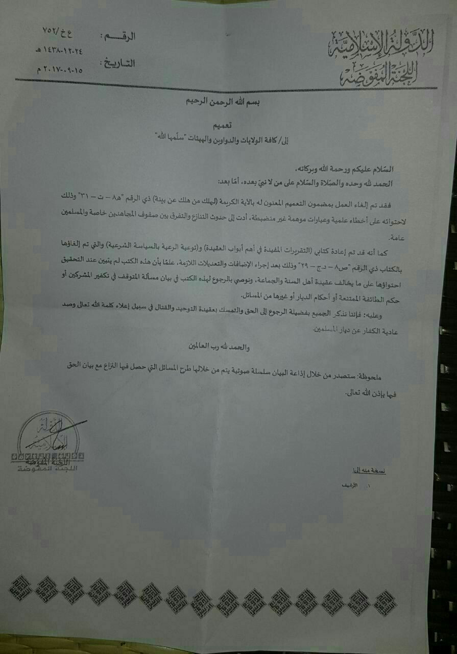 آخر ما يظهر تخبط التنظيم بين صفوفه، وتضارب قراراته وفتاواه، هو ما حصلت عليه “فرات بوست” من صورة القرار الأخير الصادر من ما يطلق عليه داعش اسم “اللجنة المفوضة في الدولة الإسلامية”، ويشير إلى التراجع عن “تكفير الجاهلين بالدين” أو تكفير ممن هم خارج أراضيه، أو الاستيلاء على أملاك من يخرج من مناطق سيطرته، أو من اعتقلهم بتهمة أنهم من “الخوارج”