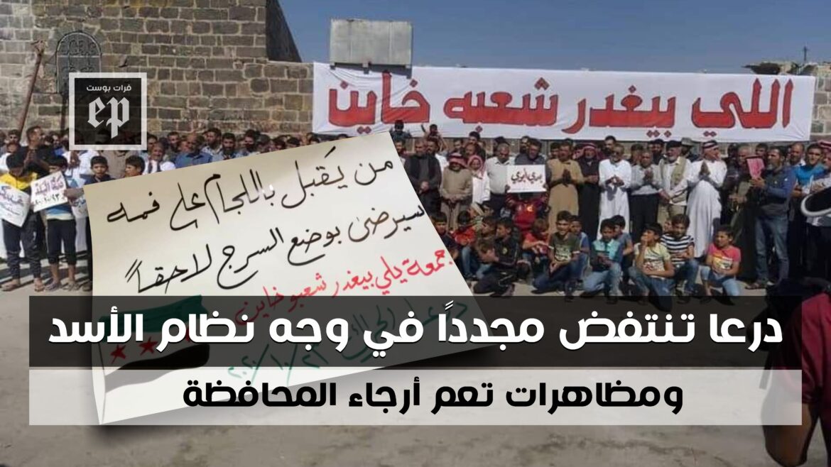 وكما خرج أبناء درعا البلد بمظاهرة في ساحة المسجد العمري، هتفوا خلالها بإسقاط النظام وطرد الميليشيات الإيرانية ونددوا بسياسة الأفرع الأمنية التابعة لنظام الأسد.