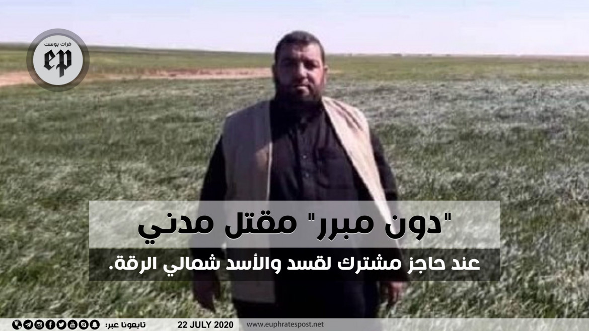 قتل مساء يوم أمس الثلاثاء شاب من أهالي حي المشلب في مدينة الرقة عقب إطلاق نار مباشر من قبل حاجز مشترك يضم عناصر لقسد ونظام الأسد في ريف المحافظة الشمالي.