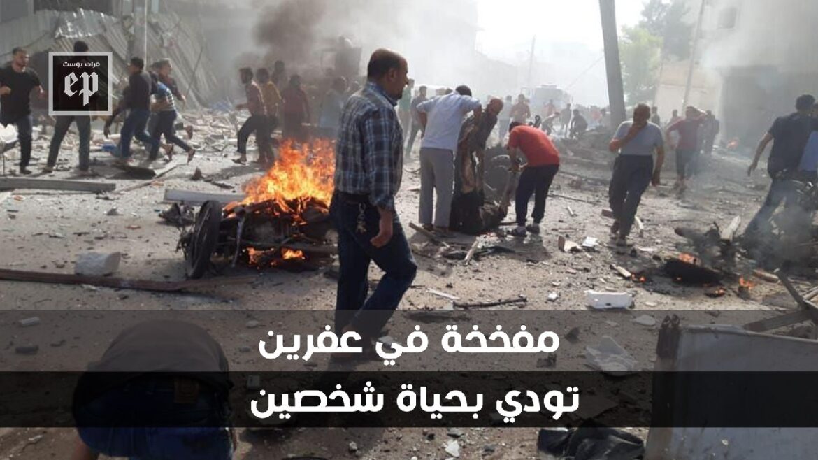 وقال ناشطون إن دراجة نارية انفجرت على طريق جنديرس بمدينة عفرين، ما تسبب بسقوط قتيلين أحدهما مجهول الهوية، بالإضافة لعدد من الجرحى.