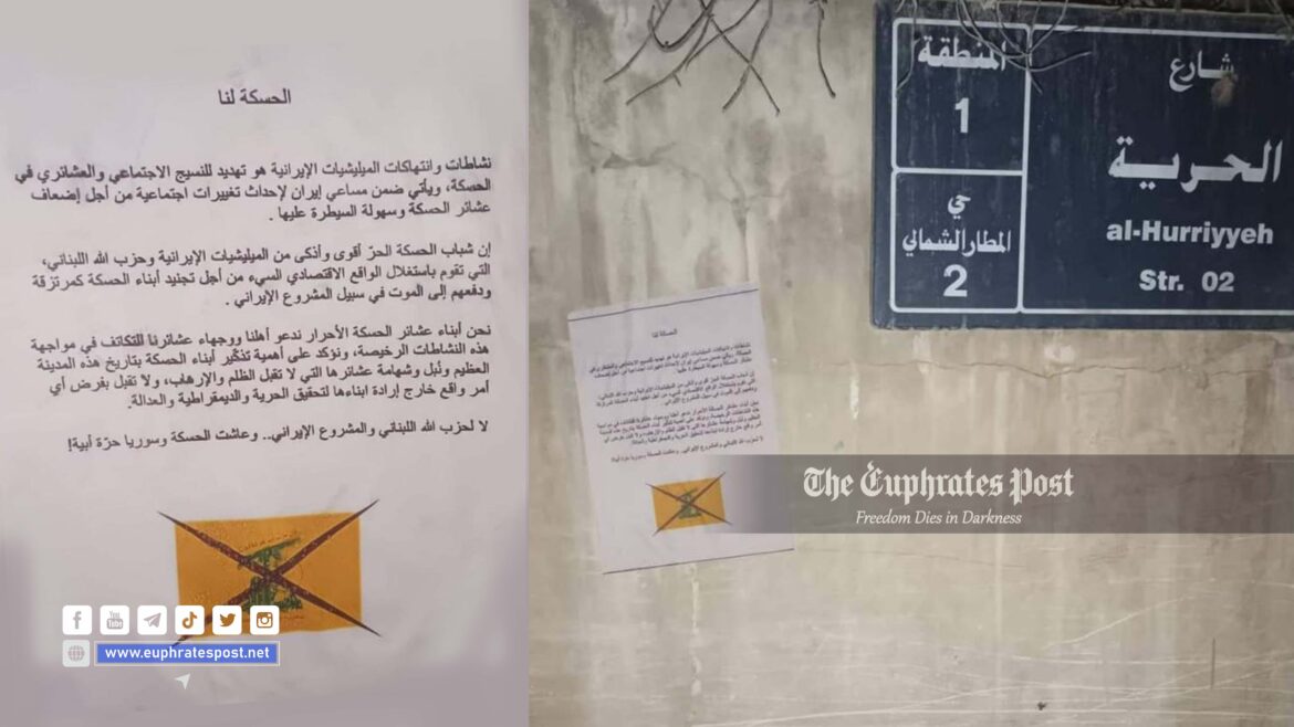 وختم البيان في عبارة رفض للمشروع الإيراني في المنطقة بجملة : “لا لحزب الله اللبناني والمشروع الإيراني وعاشت الحسكة وسوريا حرة أبية”، فيما شهدت المدينة استنفاراً أمنياً من قبل الفروع الأمنية التابعة لنظام الأسد عقب العثور على المنشورات.