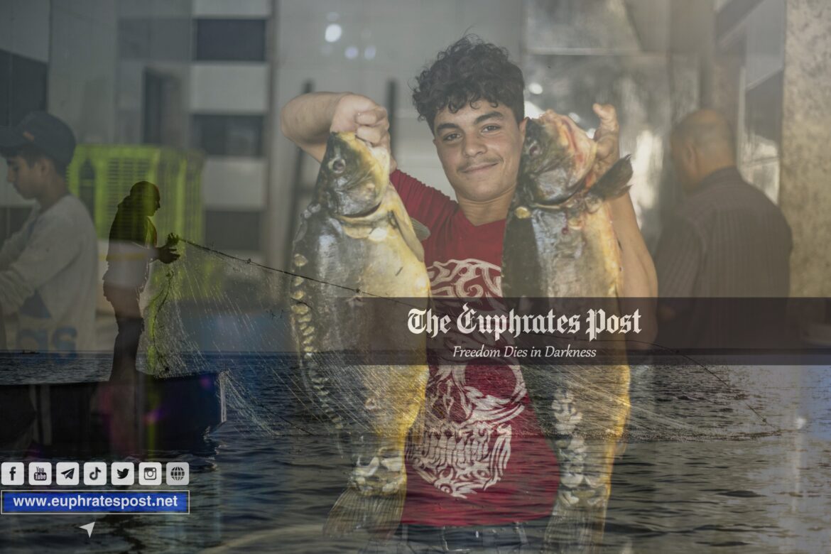 يتم عرض الأسماك على كتل من الجليد في سوق في الرقة القريبة، وهي بلدة تخضع للسيطرة الكردية منذ طرد “تنظيم الدولة” من قبل “قسد” بدعم أمريكي.