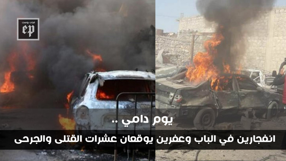 قتل وجرح عشرات المدنيين، اليوم الثلاثاء 24 تشرين الثاني، جراء انفجار سيارتين مفخختين في مدينتي الباب وعفرين بريف حلب.